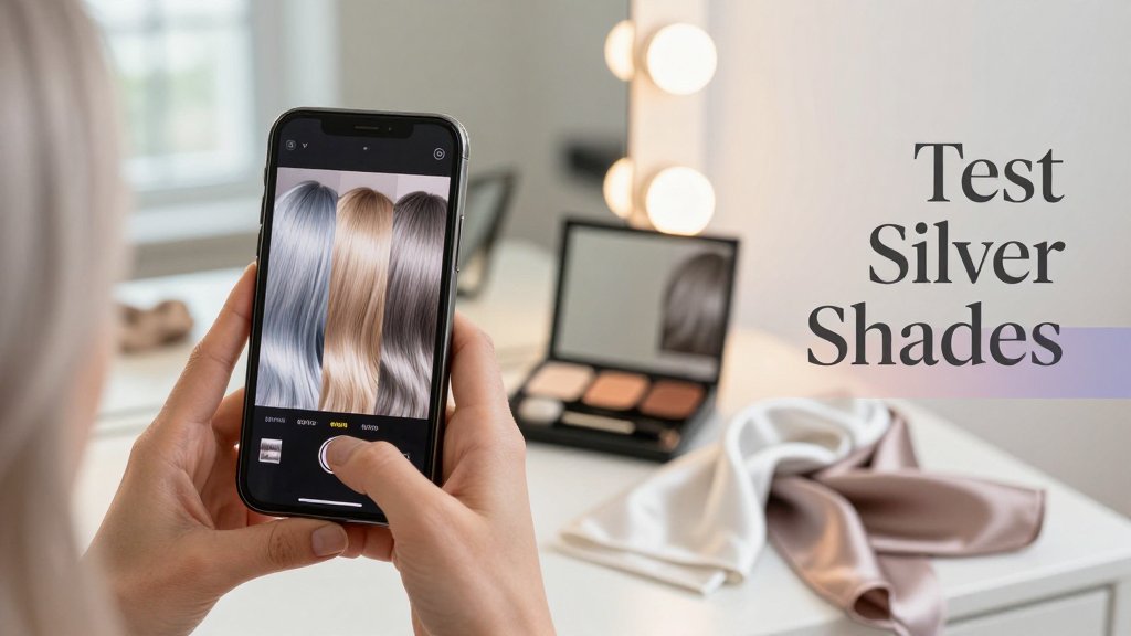 Here is a simple visual concept to guide your eye: imagine three identical swatches of “silver” placed right under your chin in a mirror selfie. Swatch A is blue-leaning (icy, steely), Swatch B is beige-leaning (champagne, mushroom), and Swatch C sits in the middle (pewter, greige). You are watching for what happens to your face, not the hair. The right silver makes your whites of the eyes look clearer, your skin look more even, and your lip color look naturally present. The wrong silver can turn skin slightly gray-green, emphasize redness, or make your features feel less defined, especially in daylight photos.