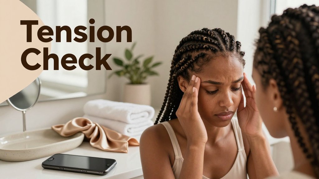 Rule of thumb you can quote to your stylist: if you feel pulling while you are resting, it is already too tight. Not “maybe,” not “give it a week,” not “beauty is pain.” A fresh set of knotless box braids, feed-in cornrows, or faux locs should feel secure, but your scalp should not feel like it is being lifted off your skull. Do your first self-check as soon as you are done (before you leave the chair or within the first hour at home), because that is when small adjustments are easiest. Then repeat the same check again at bedtime, when your face relaxes and you are not distracted by moving around.