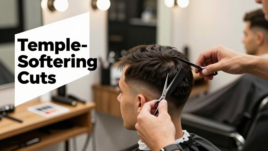 The best haircut is the one that keeps some texture and movement at the front, while staying proportional to your face. If your temples are receding, try a textured crop, short quiff styled slightly forward, or an Ivy League with a soft side part. If your crown is thinning too, avoid long, separated strands that expose scalp. Ask for scissor texture on top (so it looks dense) and a low taper or low fade (so the temples are not overly emphasized). If your hairline is high, a light fringe or forward styling usually looks more natural than a hard slick-back.